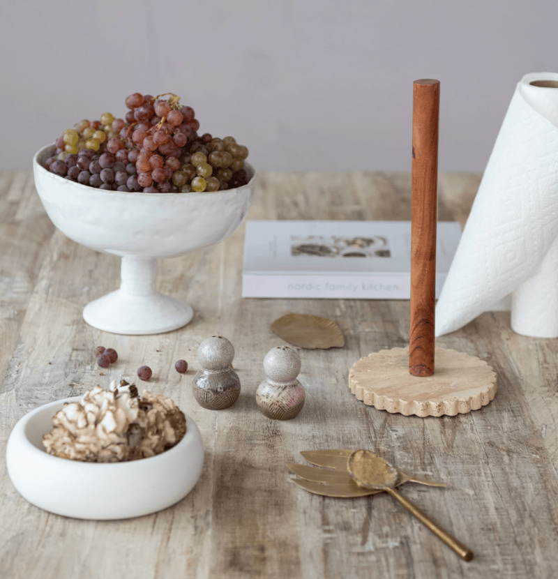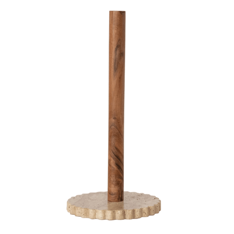 6" Round x 12-1/2"H Acacia Wood Paper Towel Holder w/ Scalloped Travertine Base, Natural & Cream Color