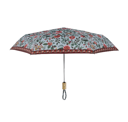 No rainy day blues here. Easily portable, our Gracie umbrella features a wooden handle, a wrist strap, a matching patterned sleeve, and an auto open/close function.