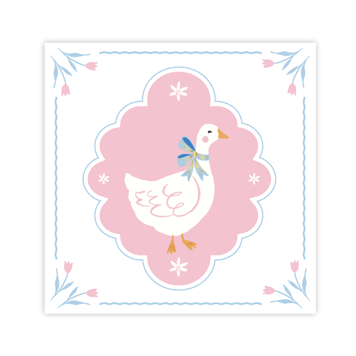 Charming Easter napkins featuring a goose with a blue bow surrounded by delicate pink tulips. Perfect for children and adults, they coordinate with matching small plates to create a whimsical and festive spring tablescape.